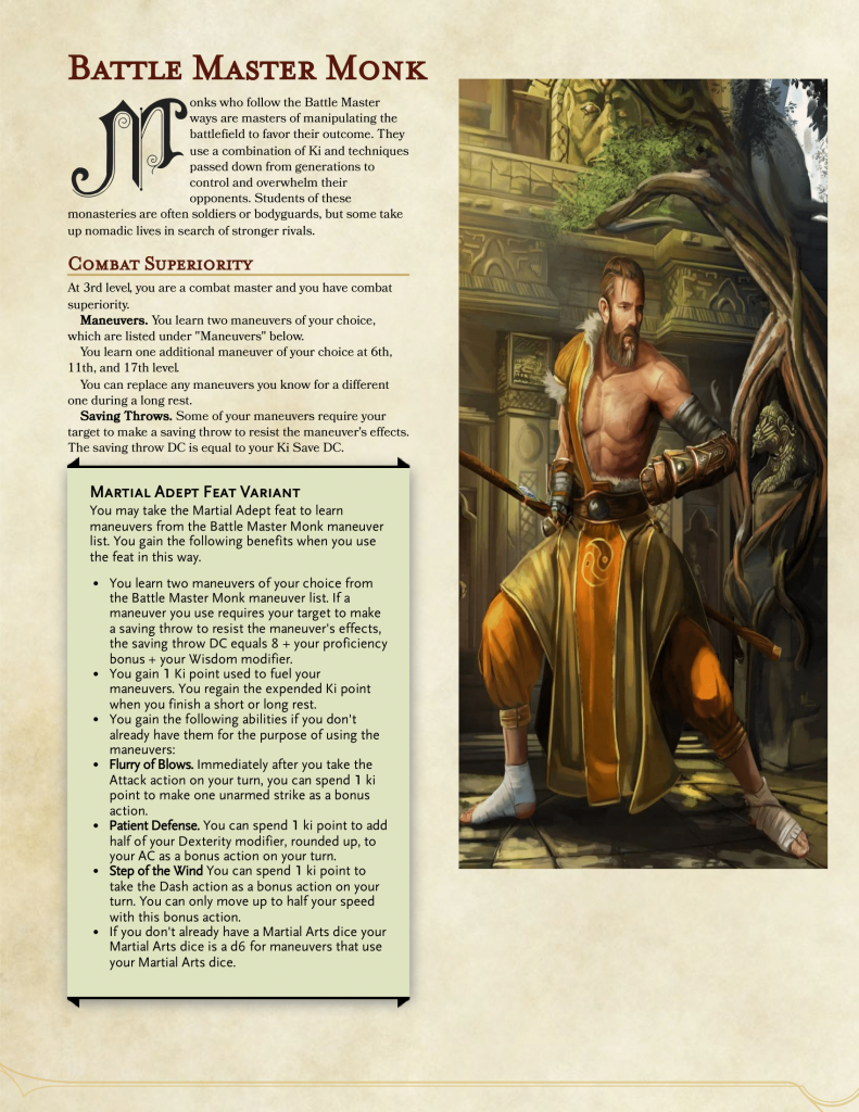 I’ve never been able to playtest this in a full campaign but in short combat scenarios I’m happy to say the class felt appropriate and gave players options to play as a combat focused martial artists who could do all sorts of acrobatics and maneuvers to control the battle field.